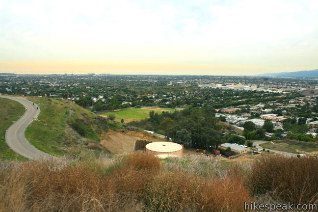 To continue up the trail, circle around the base of the steps and head west, gaining an elevated perspective over Culver City. Several recognizable landmarks stand out in the cityscape below, like Sony Pictures Studios and the triangle-shaped Culver City Hotel in downtown Culver City.