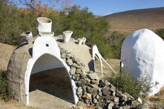 The Poly Canyon Design Village is a hamlet of unique and varied structures built over the decades by architecture students at California Polytechnic State University. Design Village is located on a quiet grassy hillside contoured by babbling creeks shaded by coast live oaks. The village is a short distance from the Cal Poly campus and creates a pleasant and interesting destination for a 2.5-mile hike with 300 feet of elevation gain.