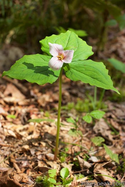Big Slide Trail travels downhill for the next 0.15 miles through a forest that charms with an attractive ground cover. Mossy boulders are framed by ferns and flowering natives like Pacific bleeding heart, candy flower, and yellow violets. Trillium steal the show in the spring, and you may even be fortunate enough to spot a rare four-petal trillium.