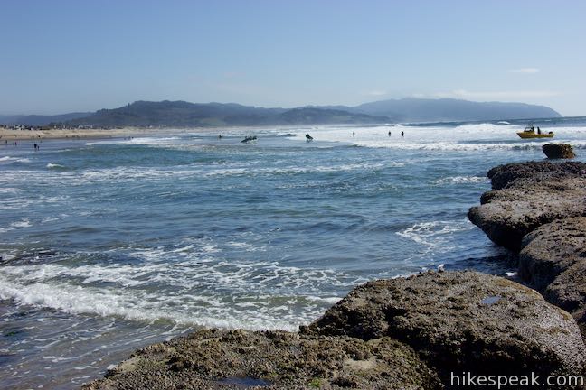 Walk 1/8 of a mile up the beach and pass a boundary for Cape Kiwanda State Natural Area. Just ahead, the beach comes to an end, running into Cape Kiwanda, which juts into the ocean. Tide pools on this side of the cape are fun and easy to explore when the tide is out. A tall dune of sand rises from the inland side of the cape. People march up this steep hill of loose sand in order to slide or run back down or get grander views up the coast to the north. Great Dune makes an arduous little climb, but the views from on top are awesome.