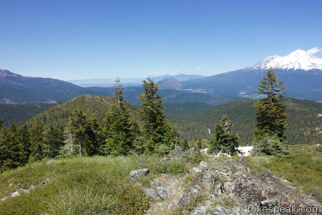 Look northeast to see familiar features from the hike up. Heart Lake is cradled beneath the peak and below that you’ll see the much larger Castle Lake. The snow-covered mass of Mount Shasta rises beyond the immediate forest. The smaller Black Butte sits to the left of the 14,180-foot volcano. In the distance, you should see the snowy peak of Mount McLoughlin, 85 miles away in Oregon.