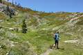 In another tenth of a mile, you will hit a split. One path branches off to the left and takes a gradual route down the side of the ridge. The other path sticks with the top of the ridge. Ahead, the ridge curves to the left around a bowl-shaped depression in the terrain and curls toward the mountain pass at the junction of Heart Lake Trail and Castle Lake Trail. You could continue along the ridge to drop down to Heart Lake Trail at a lower point, but it seems to make just as much sense to leave the ridge top here.