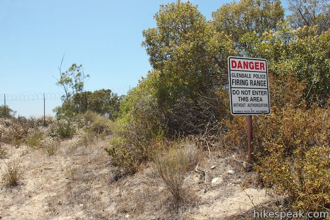 As an alternative, hikers can begin from Descanso Trail, located at the north end of the park near Descanso Gardens (directions to both trailheads are below). After the first tenth of a mile, Descanso Trail reaches a string of tight steep switchbacks that quickly ascend 100 feet (walking bikes is recommended). At the top of the climb, the trail widens into Descanso Lateral. The trail will dip across a saddle at 0.7 miles, joining Descanso Motorway, which comes up to the ridge from Descanso Gardens. Take an undulating course south down the ridge, passing a few warning signs about the Glendale Police Firing Range. Reach a T-junction at 1.6 miles, and bear right. In another tenth of a mile, Descanso Motorway joins Cherry Canyon Motorway at the Five Points junction where you should continue south up Ridge Motorway. This alternate opening leg extends the hike from 2.5 to 4.8 miles round trip with added elevation gain.