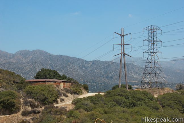Around the next bend, you will reach a junction below the fenced-in overlook at the highest point on the ridgeline. Straight ahead, you can walk up to the fence enclosing the old tower atop the unnamed 1,887-foot summit. Ridge Motorway continues to the right, rolling farther south down the ridge, while another dirt road to the left connects to the neighborhood just to the east. Make a sort of U-turn to the left to reach a dirt turnaround where there is a colorfully painted bench at the perfect place to sit and take in the view. From here there are views southwest toward Glendale and downtown Los Angeles as well as wide open views west toward the Verdugo Mountains and north toward the San Gabriels. The tower, labeled on some maps as Cerro Negro Tower, now hosts communications antennas and dishes.