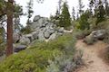 The trail angles southwest over a conifer-spotted slope above Lake Tahoe. Pass through a few small turns, weaving down through the chaparral and boulder outcroppings. Stone steps assist through the steeper terrain. Enjoy early lake views, admiring the mountains above the north side of the lake to your right.