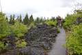 Enjoy a walk through forest for another tenth of a mile, until the lava flow cuts through the trees again (and the trail surface becomes paved). This area of the lava field is larger than the first, with bigger ridges of volcanic rock that force the trail to take on a more wandering path. The lava field extends out to points on the shore of the lake.