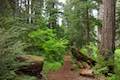 Set out on a trail just below the shelter, hiking south across a wooded bank just above Clear Lake. The fairly level trail passes through lots of greenery. Big, tall cedars rise above the rest of the forest. Bunchberry fill the forest floor, flashing flowers similar to those on dogwood trees each spring.