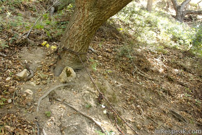 While evidence of the former residence is gone, the large cypress trees provide a shaded destination for a turnaround point. A use path continues up the canyon through lots of poison oak, employing a rope tied to a tree trunk to cross a steep bank along the creek.