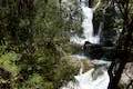 Steps and switchbacks lead you farther down the creek. Come to the brink of Corlieu Falls, after a quarter mile of hiking, where the trail makes a sharp right turn. Look out over the top of the waterfall, which courses down pitched bedrock and tumbles over boulders.