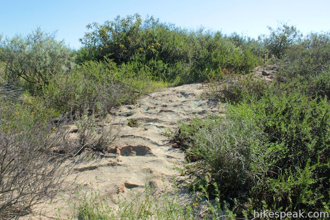 Turn left up a single track crossing the top of the ridge. You will discover great over-the-shoulder views down Moro Canyon as the trail continues to climb. Make your way up a rocky slope to a crest on the ridge that leads to a gradual section of the hike with broad views. Down the canyon to the northwest, you’ll spot an interesting sandstone outcropping that looks like a shelf on the wall of the canyon. There are several formations like this within the surrounding coastal canyons. You can look over the other side of the ridge toward the beautiful canyon to the southeast, as the Santa Ana Mountains pop up above the ridges to the northeast.