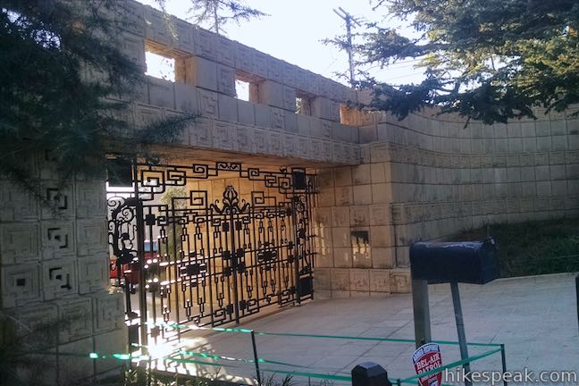 After 0.35 miles of hiking, meet a paved trail coming up from Glendower Avenue. This short paved trail into Griffith Park is just a quarter mile long, rising to a holding tank up the slope to your right. If you’re a fan of Frank Lloyd Wright, you could walk down this trail to Glendower Road, take that to an intersection with Glendower Avenue and walk 0.2 miles east to the Ennis House, which was built in 1924 and is not open for tours (exterior photos below). This extension would increase the hike by 0.8 miles round trip. Otherwise turn right up the paved trail. You will immediately come to another junction where the wide dirt trail resumes. Turn left to continue hiking up East Observatory Trail.