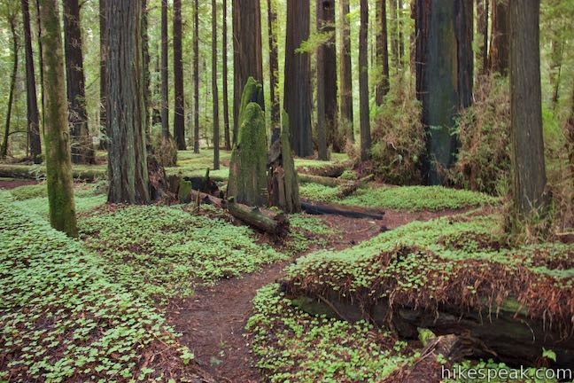 The trail that you are on will splinter into paths that delve into different pockets of the grove. These paths go through alluring patches of sorrel and may inspire you to linger and explore. To efficiently return to the trailhead, favor making right turns at each split.
