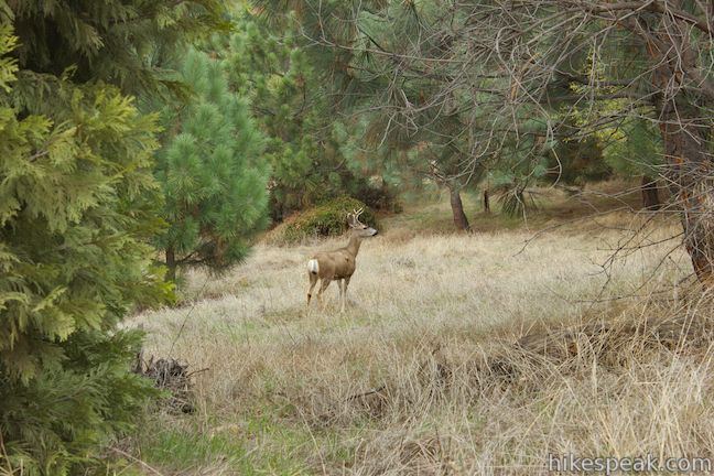 A tenth of a mile from the sign, you will come to a right hand bend in Mount Wilson Toll Road outside the Visitor Information Center. If you are continuing on to the helipad loop, or hiking to the Upper Campground, you can turn right to stay on Mount Wilson Toll Road. Otherwise, turn left and step inside the Henninger Flats Visitor Information Center where you can look at a relief map of the San Gabriel Mountains and learn about the history of Henninger Flats. In addition to finding out about the trees grown on Henninger Flats, you can also see examples of animals in the San Gabriel Mountains.