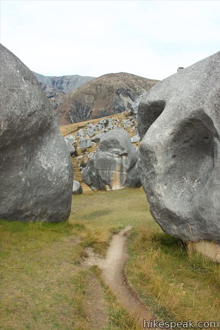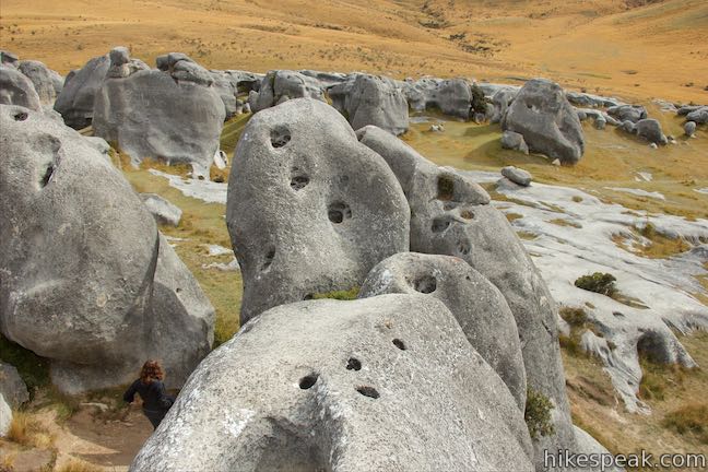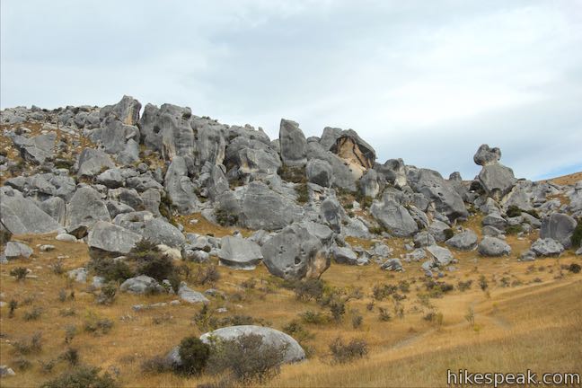 To get to the trailhead: From Sheffield (which is just over 50 kilometers west of Christchurch), take State Highway 73 northwest for 40 kilometers. At 7.5 kilometers past Lake Lyndon, turn left into the car park for Kura Tawhiti / Castle Hill Conservation Area. Coming from the other direction, the parking area is 53.5 kilometers from Arthur's Pass Village, 20.5 kilometers past Lake Pearson (Moana Rua) Campground, and 3.5 miles past the small town of Castle Hill.