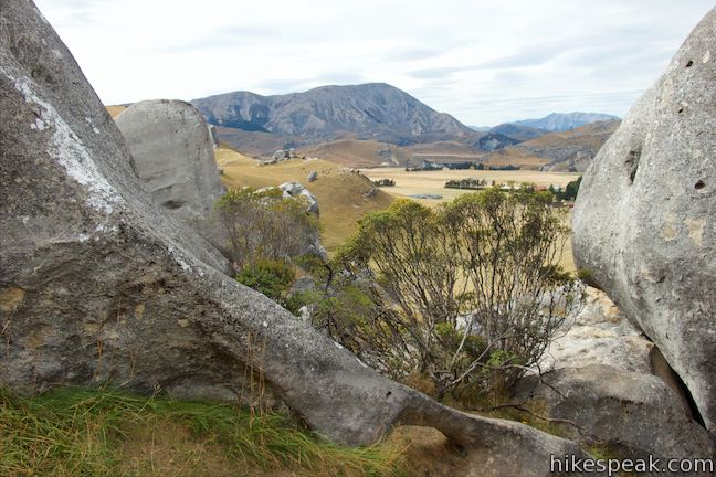 Take a worn path between limestone monoliths. When you get higher up the hillside, turn right and make your way around more of the boulders. Soon you’ll be able to move across the tops of the boulders that you looked up at from the end of the Kura Tawhiti Access Track. Look back down the track toward Mount Plenty and Castle Hill Peak to the southwest.