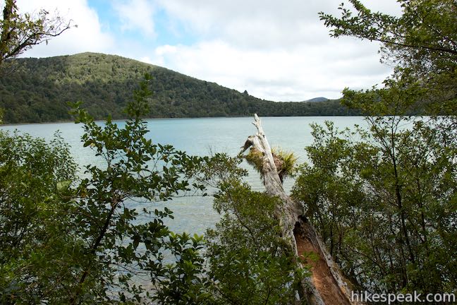 Step out on a pebbly beach and gaze across the lake. A dense forest surrounds the blue-green waters. Above the lake to the southeast rises Mount Pihanga. The hike’s best views of that 2,369-meter peak are from Five Minute Beach.