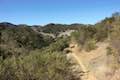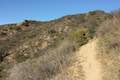 The trail makes a right turn at the crest and drops steeply toward a saddle on the ridge. Partway down the slope, spot the ruins of an old foundation on the right side of the trail. Make your way down and have a look at the ruins. The west-facing slope also offers a good perspective toward Malibu Creek State Park.