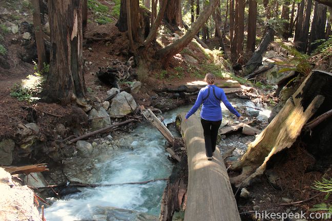 In another tenth of a mile, you will pass a junction with Pitkins Curve – California Coastal Trail on the left and cross a final bridge over to the north side of the West Fork of Limekiln Creek. The canyon walls come closer together as the trail squirts across narrow ledges above the creek. This area has nice walking along the creek, but then again, it’s hard to find any areas along these trails that aren’t pleasant.