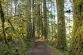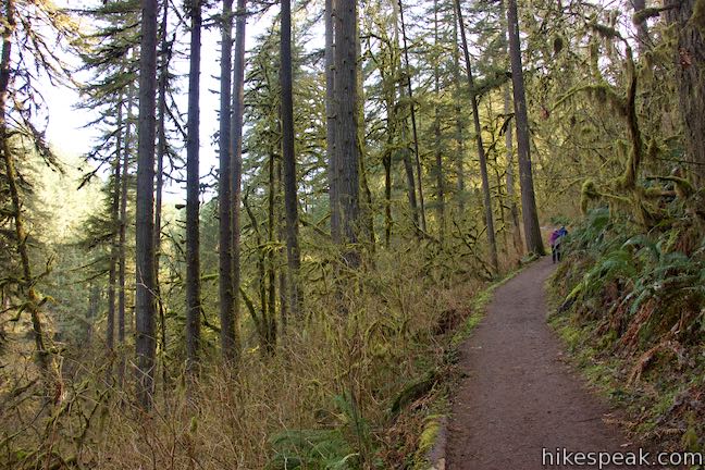 Later on the hike, you’ll be looking up at the tall waterfalls, so why not stretch your neck out a little bit now and look up the tall tree trunks bordering Maple Ridge Trail. The trail weaves through mature hemlocks and Douglas firs, and of course the grand maples for which the trail is named. The forest is lovely (probably especially so in the autumn). The trees grow tall and straight. Their trunks are covered with moss. Tinsel lichens hanging from low branches. The forest canopy provides plenty of shade for even more greenery along the trail, like salmonberry, sword ferns, Salal (Oregon wintergreen), Oregon grapes, and Pacific bleeding hearts. Enjoy a relaxing woodland hike on a wide, dirt single-track trail.