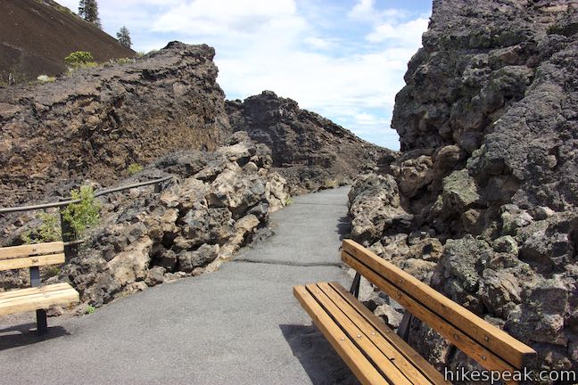 Trail of the Molten Land has a loop in the middle with two non-loop sections at both ends. The junctions are obvious. All you have to do is stick with the paved trail and there should be no way to get off course. Begin up Trail of the Molten Land through the last forested area at the edge of the lava flow. You will quickly reach one of the many informative panels describing how this landscape was formed. The first panel welcomes you to the molten lands: