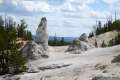 About a tenth of a mile before Monument Geyser Basin, the trail tapers out and offers a new view to the south down a rocky trench toward a lower (and less wavy) section of the Gibbon River. Soon after, the forest parts and you will find yourself standing on bleached rocks with steam gushing out of the ground in front of you. You have arrived at Monument Geyser Basin.