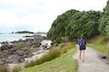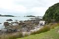 Base Track crosses a grassy slope around a small sandy beach. Look out across a channel toward a long forest-lined beach on Matakana Island. This island runs directly to the northwest and forms a protective barrier for Tauranga Harbour. Base Track clings to the coast, gently rolling in and out of trees past several benches. Proceed a kilometer up the coast to a rocky point at the northwest end of the peninsula, 1.5 kilometers from the start of Base Track. From a bench positioned here, you can gaze out over the channel and bay.