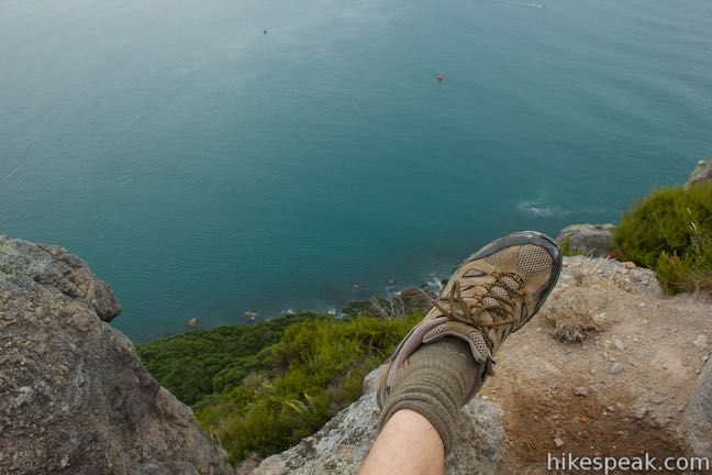 At the bottom of Waikorire Track, you will have hiked 5.8 kilometers if you followed the directions across the summit or 6.1 kilometers if you followed the directions for the summit loop, twice hiking a 150-meter long section at the west end of Waikorire Track (add another 200 meters if you ventured out on the path out to the lookout that’s not a lookout).