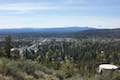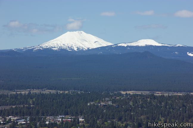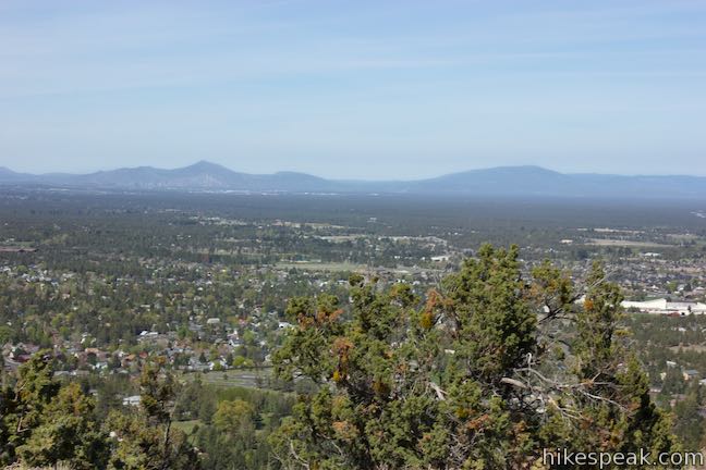 The city of Bend spreads out below the butte. Downtown and the Old Mill District should be easy to identify, cloaking the Deschutes River. Beyond the city to the southwest rises Mount Bachelor, the area’s premier skiing destination.