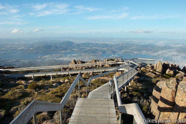 If the weather is fine, keep walking out on the boardwalk. Walk down a flight of stairs and come to a viewing platform on the right. Step down to the overlook and take it all in! On a clear day, you’ll be able to look east over Hobart and south down the River Derwent toward the peninsulas and bays along the southern edge of Tasmania.