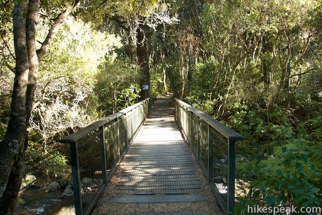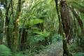 The marquee trees along this loop are the Rimu trees, or red pines, which can rise over thirty meters tall and grow to be several hundred years old. There are smaller trees to examine along the loop as well, like Mahoe. Ferns and tree ferns line the level track as well.