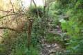 Find Rustic Canyon Trail entering Topanga State Park from the east side of the Will Rogers Polo Field. Hike a third of a mile down a maintained dirt single track dropping into the canyon. When you hit the creek turn left and head up the canyon. The nice trail disappears, leaving you to pick your way up the canyon. A footpath flip-flops across the creek up the narrow canyon through a jungle of vegetation. This is a wild canyon without much of a conduit for hikers. After half a mile you will reach a check dam built across the creek where an artificial waterfall flows. Take the steep track up the dirt slope to the right and continue upstream. It is another mile of bush washing and creek crossing to reach the ruins of Murphy Ranch. When you get close the main ruins, the trail crosses a wooden stable being overgrown by the forest. Stay on the right side of the creek and continue up a faint single track that breaks out of the trees onto a dirt road.
