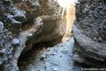 The mouth of the canyon is difficult to spot from the trailhead. Begin hiking south toward the gravel fan exiting the canyon. Cairns and footprints will appear, marking the way. After 0.4 miles, the path enters the canyon. Turn left and march up the semi-steep gravel. A side canyon on the left and another on the right come before the first real slot canyon. The side canyon to the left climbs gradually up out of the canyon, while the canyon on the right goes back for some distance before dead-ending at a dry falls. Either is worth checking out, especially on the way back.