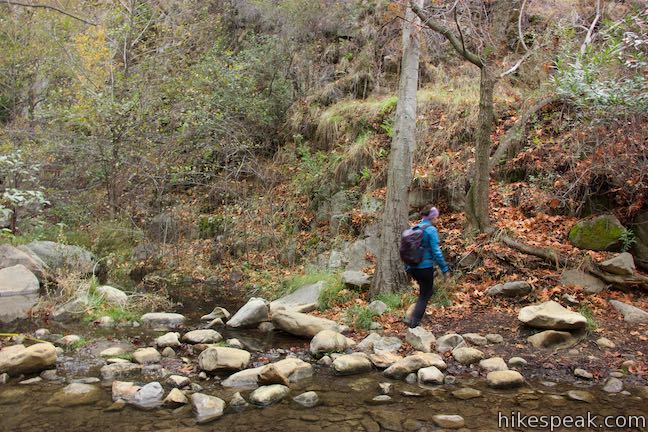 The canyon walls pinch tightly together as Sisar Canyon Trail drops to the creek again for a second crossing, 1.65 miles from Sisar Road. Glance up and down Sisar Creek, where water slides around boulders. Rock hop your way back to the west side of the canyon. The trail rises more steeply into the moderate trail’s most demanding stretch.