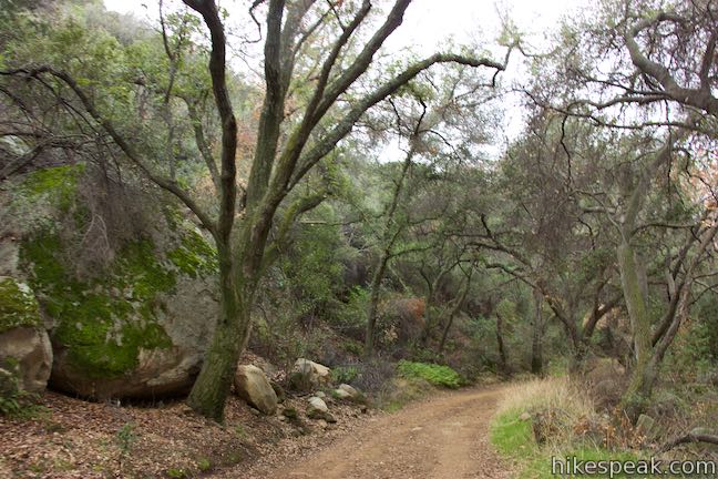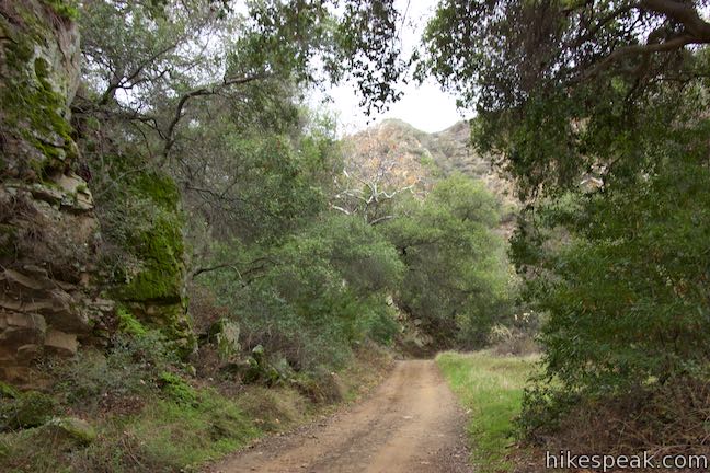 To your right, the terrain drops toward the boulder-filled trench at the bottom of the canyon where oaks, sycamores, and alders gather around Sisar Creek. The wide trail rises at an easy-going grade before briefly turning downhill to the former trailhead site, which has a gate and room for parking. This spot on Sisar Canyon Road is 1 mile from Route 150 and 2.25 miles from the overlook on Sisar Canyon Trail, with 950 left to ascend.