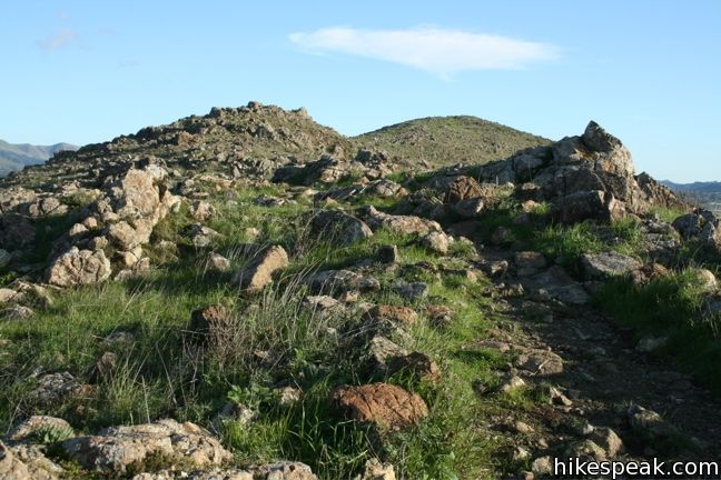 Left of the junction, the single track crosses the saddle and meets the rocky ridge. The trail angles to the right, southeast, up through the rock formations, becoming faint in places as it tackles a slope of blue-gray boulders circled by brushgrass. The views become progressively more panoramic as you climb. North of the city rises Cerro San Luis (or San Luis Mountain) and behind that is Bishop Peak. Laguna Lake and the Irish Hills are in sight to the west, and the Santa Lucia Mountains can be seen to the east and south, framing the Edna Valley. Eventually, the easternmost Morro, Islay Hill, becomes visible as well.