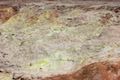 The rocks along the boardwalk display yellow sulfur crystals coated with sulfuric acid. Water vapor rises from the earth. Other gasses reach with the rainwater to create hydrofluoric acids that corrode rocks and create cracks and cavities for more steam. In addition to the sulfur crystals, white deposits of opal and the dark red of hematite are also present. The temperature underground is above 200 degrees Fahrenheit, which cooks the rocks and powers the hydrothermal activity.