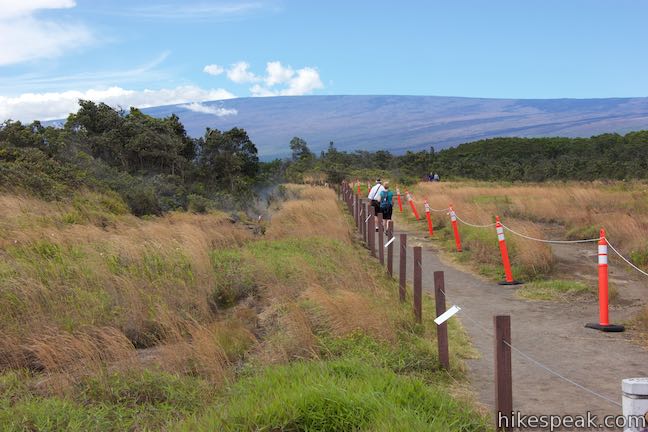 To get to the trailhead: Take Hawaii Belt Road (Route 11) to the entrance of Hawaii Volcanoes National Park (which is 30 miles south of Hilo). The park entrance is on the left when traveling from Hilo. Drive past an entrance station to the first intersection. Stay to the right on Crater Rim Drive and then pull into the parking area for Kīlauea Visitor Center. The parking area on the far side of the visitor center is closer to the trailheads.