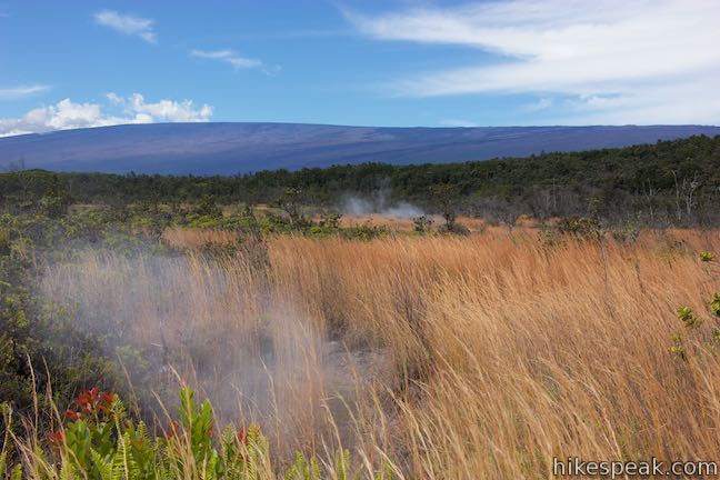 Walk through a short band of forest to a larger meadow alongside Kīlauea Caldera. This area has reason to be treeless. Steaming vents and fumaroles can be observed along the trail. The meadow also provides open views of Mauna Loa, so enjoy grand volcano vistas!