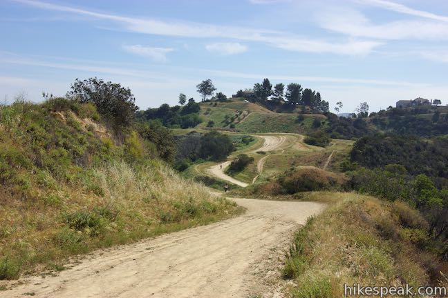 At the base of the descent, and 2.35 miles from Old Topanga Canyon Road, Summit to Summit Motorway passes a path on the right that drops off the ridge and connects to other trails in Summit Valley Edmund D. Edelman Park.