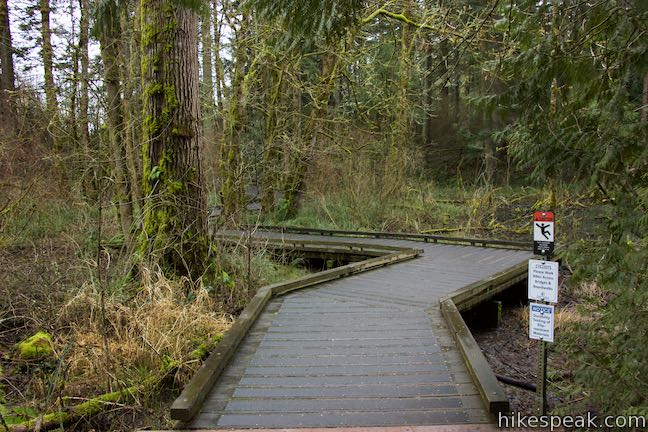 Old Wagon Trail is a dirt trail with a long section of boardwalk that begins 150 yards from Vine Maple Trail. The trail and boardwalk pass through marshy forest on the north side of the park. While on the boardwalk, make a right turn as Old Wagon Trail passes another access trail.