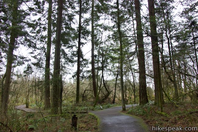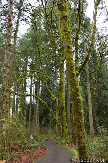 Leave from nature park interpretive center by the main parking area and walk up the path between the center and a bathrooms building to the start of Vine Maple Trail. Walk about fifty yards up this wide paved trail to the first of many marked junctions. At this important intersection, Oak Trail parts to the right to head north. Unless you prefer to hike the loop in a counter-clockwise directions, stay to the left on Vine Maple Trail.
