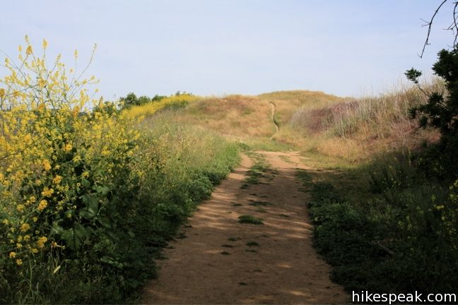 The road remains gradual, while the narrow trail undulates with the contours of the ridge. After one mile, the fire road crosses another trail, Hollyhock Fire Road, which heads west into Mandeville Canyon.