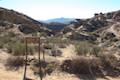 Proceed down this ridge for 0.55 miles, staying to the right when the PCT is joined by another path from the Famous Rocks Area. A sign marks the edge of a wildfire that hit this area in 2007. A trail marker leads down the right (west) side of the ridge. Take this trail and descend into a V-shaped gap in the terrain. Fins of sandstone jut out of the ridge on the other side.
