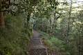 Across the bridge, the track ascends through a forest of cedars and beech trees. Patches of ferns and moss line this pleasant woodland path. After 0.6 kilometers of hiking, go up a staircase built into the track that goes up and around a rock outcropping.