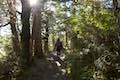 The boardwalk leaves the wetland and drops back into the forest where a dirt trail resumes. Head downhill on ridges covered in beech and cedars, passing another bench at 1.8 kilometers from the start. The track rolls out a few switchbacks as it drops into the canyon that contains Waitonga Falls.