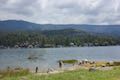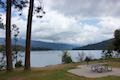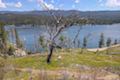 Enjoy 180-degree views (or maybe closer to 270-degree views) over beautiful Bass Lake. Gaze southeast down Bass Lake Reservoir, where tapered evergreen-covered ridges frame its cool blue water. The far end of the lake looks gorgeous. Resorts and homes in the town of Bass Lake hug the shore on the opposite side of the lake. Forest-covered ridges rise above the lake. Snowy mountain crowns appear in the distance to the north.