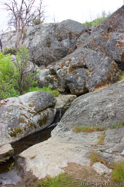 Pass underneath the granite dome (remember standing on top of the loop’s high viewpoint). The creek that you crossed above slips out through a jumbled pile of boulders that resemble a talus cave. Hop across the little creek and watch the water spill down a granite slide. After very heavy rains, the diminutive creek could swell to something showy through these granite features.