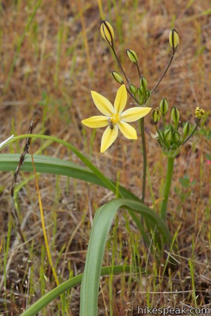 Pick up the dirt single track crossing through brush and hike out to a switchback. The trail turns left and makes its way across the slope below the granite dome at the top of the loop. The mountainside has a scattering of old fire-charred trees, but the vegetation is mostly open to lots of lake views. The exposed east-facing slope is also home to a bouquet of summer wildflowers like irises, yellow stars, checkerbloom, and a couple lovely varieties of lupines.