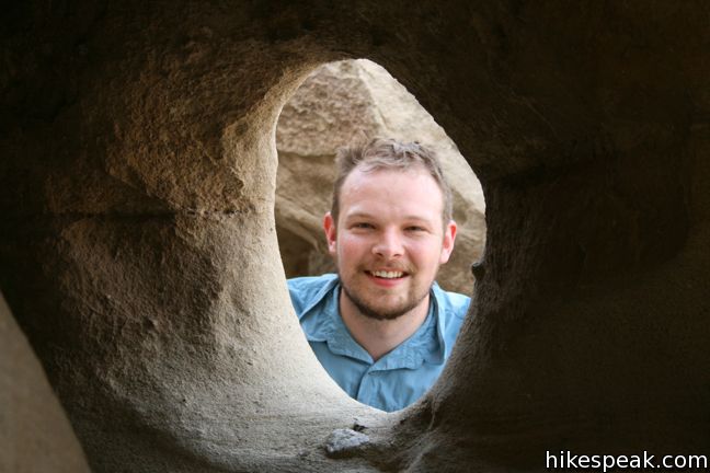 A few single tracks split off up the undulating mountainside. They all end up at the same place, but try to stick to the most worn trail. After one last rise, the wind caves come into view. The pocketed sandstone is full of interesting alcoves, caves and tunnels. Crawl through, climb over, and investigate.