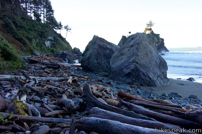 You will reach Hidden Beach at 1.1 miles from Lagoon Creek Picnic Area. Step over and around a jumbled barrier of driftwood logs to the rugged beach. Massive boulders rise out of the gravel and ocean water to the south, leading to an alluring rocky point that juts into the ocean. The beach stretches out to the right, inviting you to stroll up the shore. You can easily walk a tenth of a mile in this direction before boulders start to dominate the coastline.